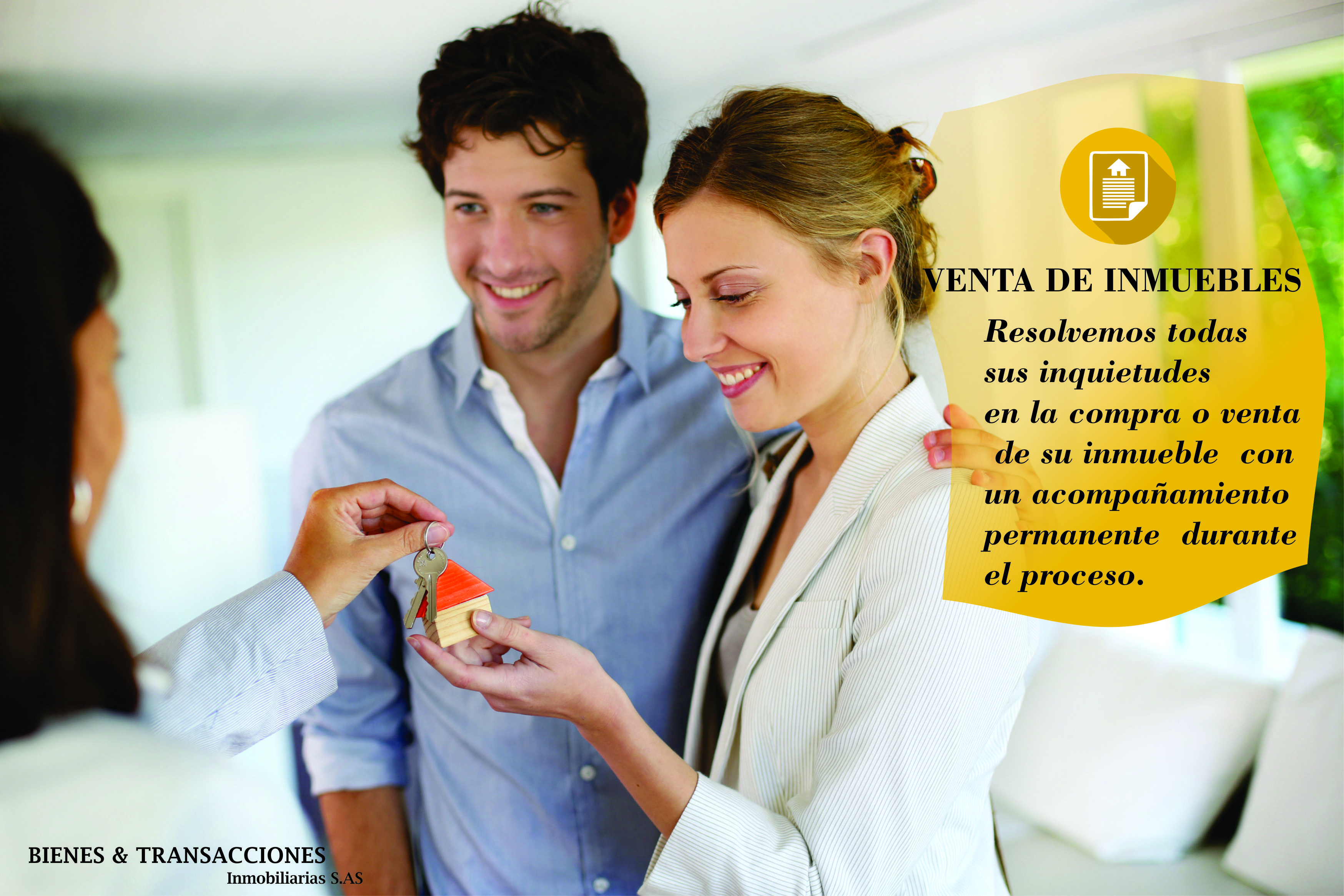 Se visita directamente el inmueble, conociendo su entorno, el estado físico y funcionalidad de las construcciones y mediante MONITOREO DE ZONA y estudios de mercado, se emite un CONCEPTO DE VALOR para la venta del inmueble, el cual se encuentra supervisado por nuestro Departamento de Avalúos. Revisamos los documentos del inmueble, tales como: Certificado de Tradición y Libertad, Estado Cuenta de Impuesto Predial, Contribuciones IDU, Escrituras, Recibos de Servicios Públicos, Estado de Cuenta Administración etc, con el fin de asesorar al propietario en el estado jurídico y tributario del bien, y así generar las directrices y formas de trabajo necesarias para la VENTA. Como inicio del manejo promocional ubicamos los carteles de VENTA de INMUEBLES en ventanas del bien, porterías etc. Así mismo administramos los medios publicitarios requeridos para obtener la VENTA del bien según el tipo de inmueble, tales como: Avisos en prensa, prensa especializada, Internet, vallas, pendones, volantes, brochures, correo directo etc. Circulamos la información con respecto al bien con las inmobiliarias colegas establecidas como Red de Negocios. Atendemos recepción de llamadas a los potenciales interesados en la compra del inmueble, proporcionando una completa y detallada información, a fin de generar cita en el inmueble con los interesados. Orientamos al potencial comprador en la obtención de documentos, realización de trámites necesarios para gestión de créditos y/o documentación requerida para la negociación. En relación con las ofertas emitidas por los interesados en la compra, evaluamos la forma de pago, disponibilidad de dinero, plazos y en general todo lo concerniente a la oportunidad de negocio para las partes, entendiéndose que asesoramos al Vendedor y al Comprador en todas las gestiones para la legalización de la respectiva compraventa. Una vez las partes convengan las condiciones de negociación, elaboramos la respectiva promesa de compraventa, documento que contendrá todos los acuerdos y parámetros establecidos, para ser debidamente legalizada por Comprador y Vendedor. Una vez legalizada, nuestra empresa recibirá el pago correspondiente de honorarios equivalente al 3% + iva del valor de venta. No obstante acompañamos a Comprador y Vendedor hasta la firma de la respectiva Escritura de Compraventa, supervisando los pagos acordados, y la entrega del bien al comprador. Finalmente orientamos al Comprador en los trámites de beneficencia, registro y catastro y caso de inmuebles sometidos a propiedad horizontal, se presenta a los nuevos propietarios ante la administración.
